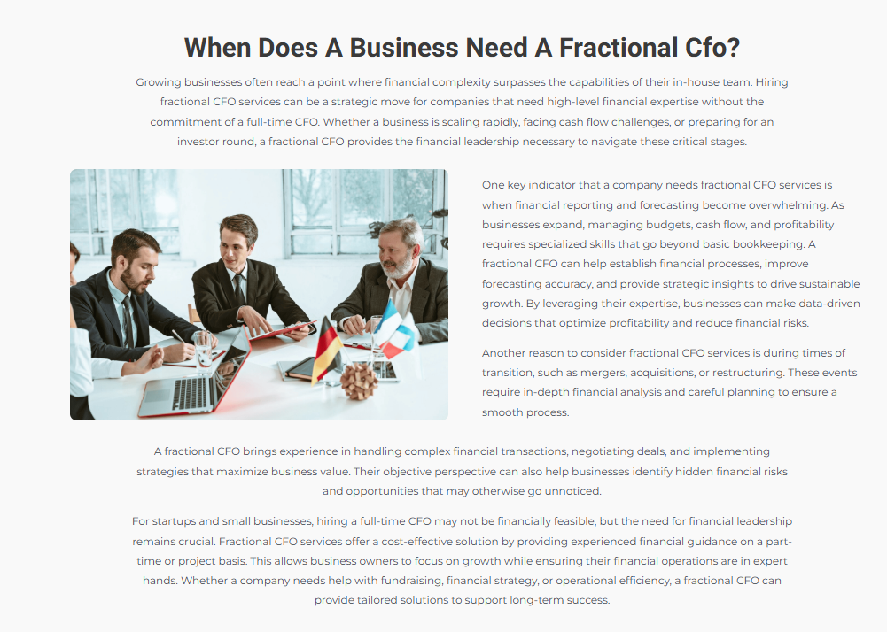 - Established Enterprises: Mature businesses leverage fractional CFO services to optimize processes, enhance profitability, and implement advanced strategies.