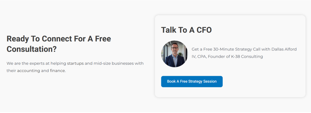 K-38 Consulting, LLC specializes in providing tailored financial solutions for startups and small businesses. Their services include R&D tax credit services, outsourced CFO services, startup CFO services, fractional CFO services, and controller services.